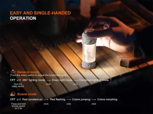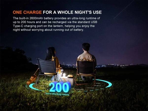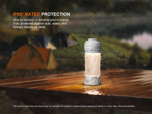 Small, compact, and fun, the Fenix CL22R Rechargeable Lantern is a great option for camping and backpacking. A 360° light is used for lighting up your entire campsite while a down-facing light is used for more precise light—and is powerful enough to be used as a flashlight. The easy to use rotary dial activates the light and increases/decreases the brightness. With the light off, tap the top button to access a red light, red flash, and two modes of decorative disco light which creates a colorful atmosphere in your tent. Extremely small and light weight, this lantern is a great option for backpackers, and its IP65 dust/waterproof rating will help this lantern hold up to any weather the trail may bring. Fun and versatility are what make the CL22R the lantern to have at your campsite.