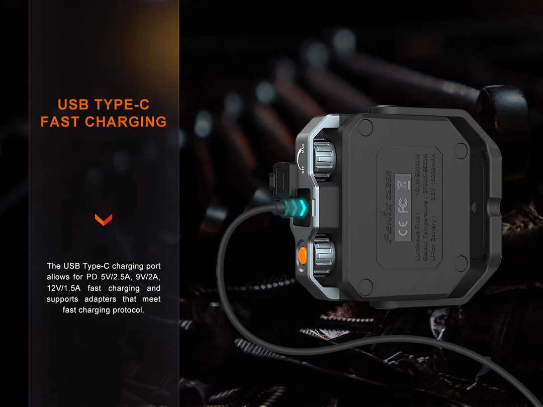 - USB Type-C charging port features charging indication and low-voltage warning.