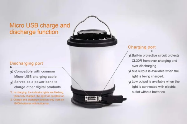 Brightly illuminate entire rooms and charge other electronic devices at the same time with the versatile CL30R lantern. This rechargeable LED lantern features a standard USB port to charge your phone, speaker or tablets. Equipped with five brightness levels and alert flashing, this lantern is great for car camping, rustic cabin stays and even power outages.