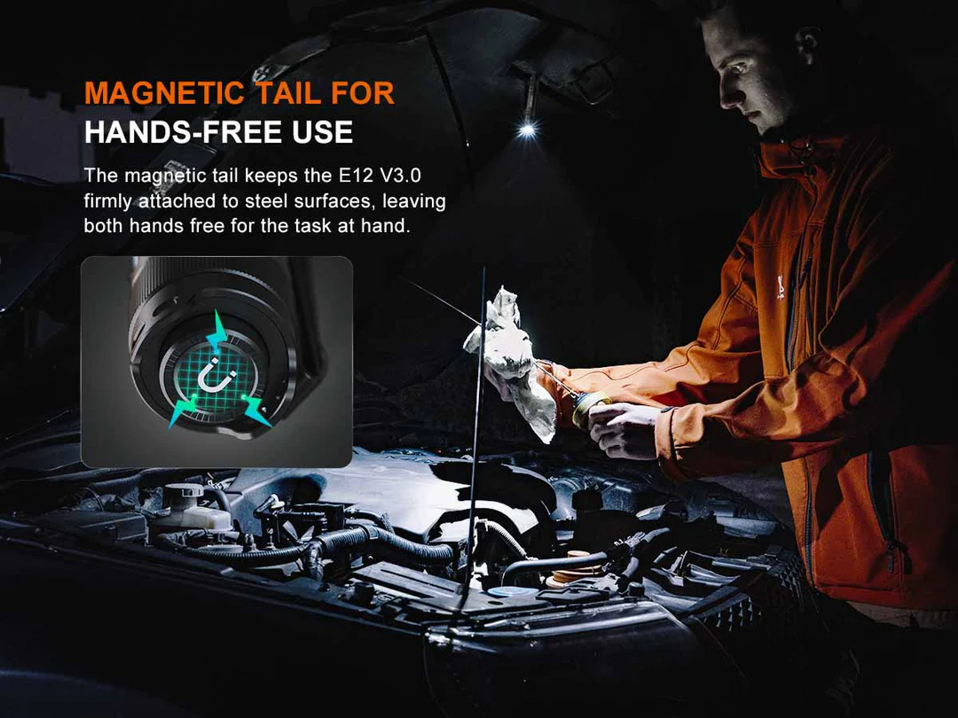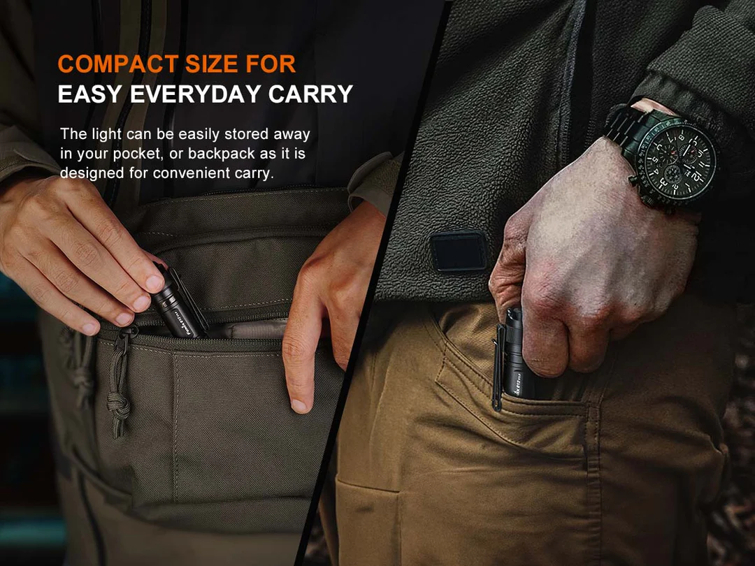 The Fenix E12 V3.0 AA-Powered EDC Flashlight emits an impressive maximum of 200 lumens, a max distance of 256ft (78m) from an included single AA battery. At only 3.21″ long, this flashlight is a great everyday carry size, and with its two-position body clip, you can carry it as you want—even clip it to your hat for hands-free lighting. Attach this light to any steel surface with a magnet in the tail switch. This little flashlight is built tough with an IP68 dustproof and waterproof rating. It’s hard to beat the ease of powering your flashlight with one single AA battery. Super small and bright, the Fenix E12 V3.0 is an excellent choice for those looking for an AA-powered small EDC flashlight.
