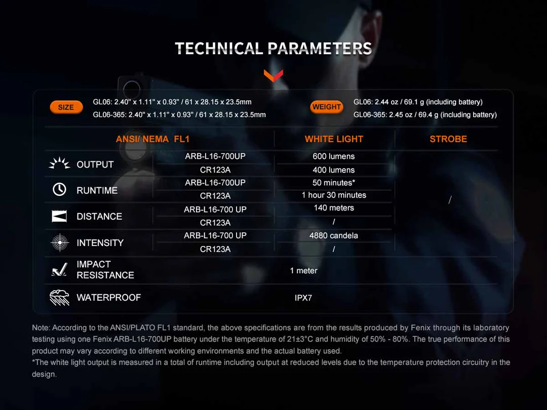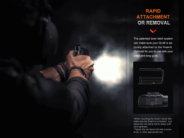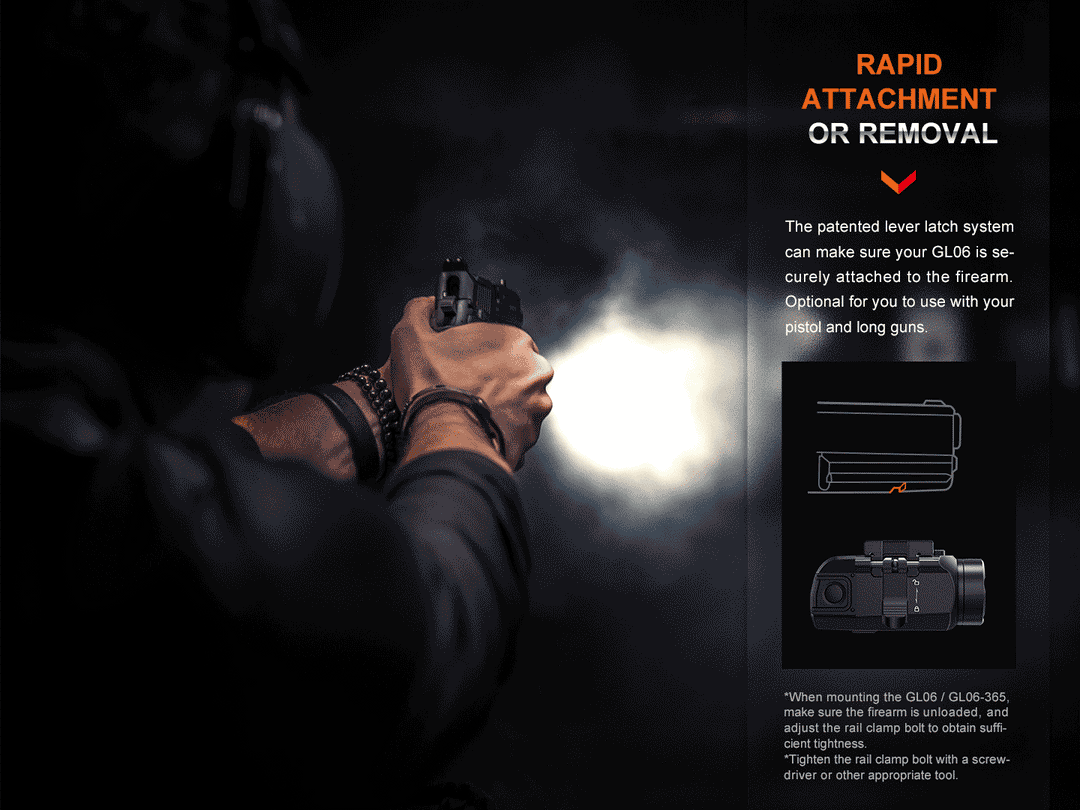- The Fenix GL06/GL06-365 is a compact weapon light that features a maximum output of 600 lumens and 459ft (140m) beam distance which allows you to easily spot your target no matter how dark it is. Specifically designed for compact pistols, this gun light will fit select pistols with barrel lengths of 4” or longer. It will not fit 3” sub-compact models. The GL06 model is used for pistols that utilize GLOCK® or Picatinny rails. The GL06-365 model fits SIG SAUER® P365, P365X, P365-380, P365XL, P365 SAS, and possibly any other type of firearm that shares that same rail type. Patented quick-release structure and dual tactical tail switches provide users with fast and easy operation.