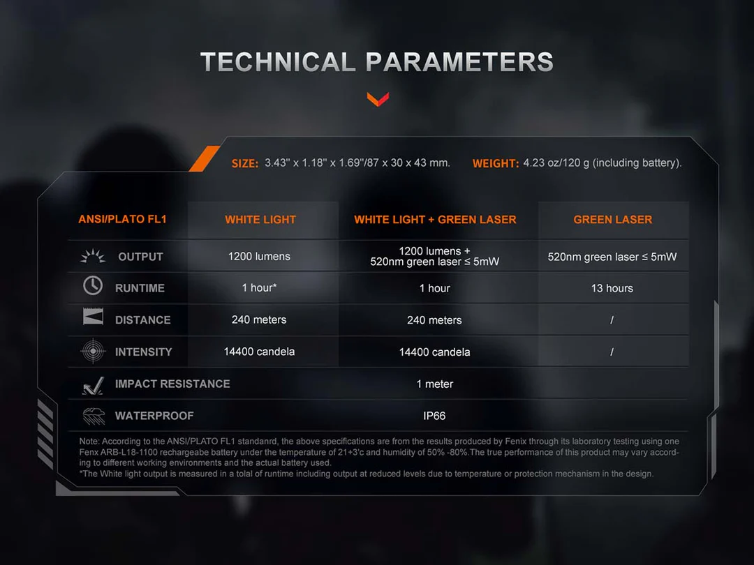 - Included a Fenix ARB-L18-1100 rechargeable battery.