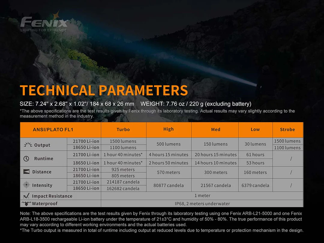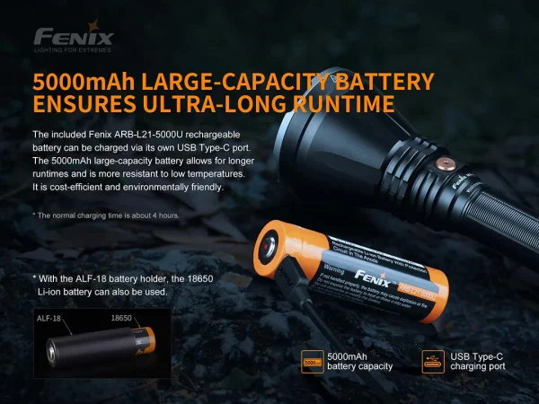 - Included a Fenix ARB-L21-5000U USB rechargeable 21700 Li-ion battery.