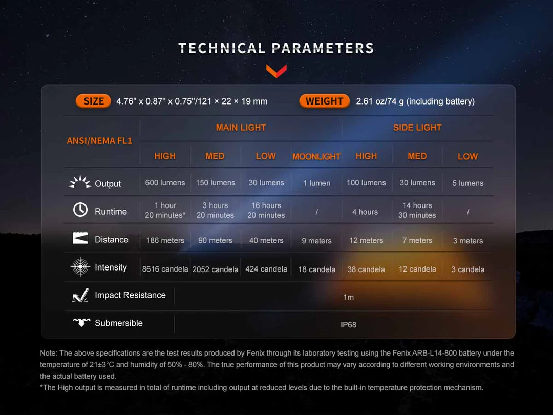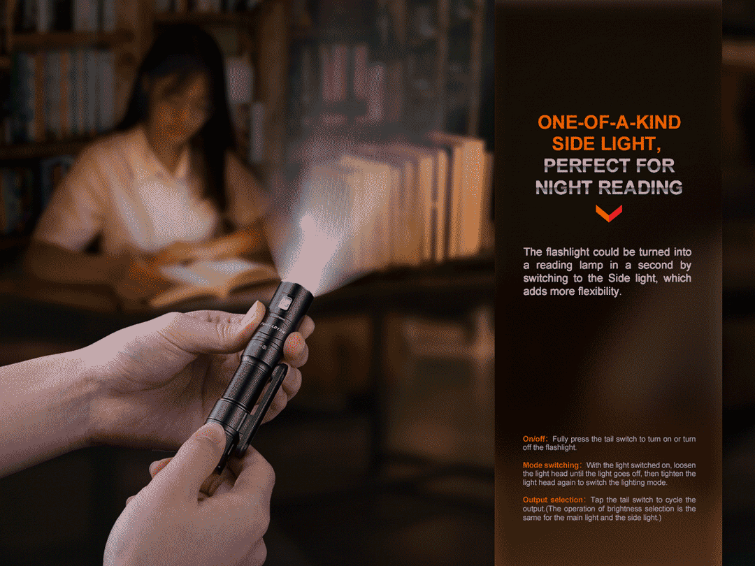 - Convenient flashlight head rotary design for quickly choosing between main light and side light