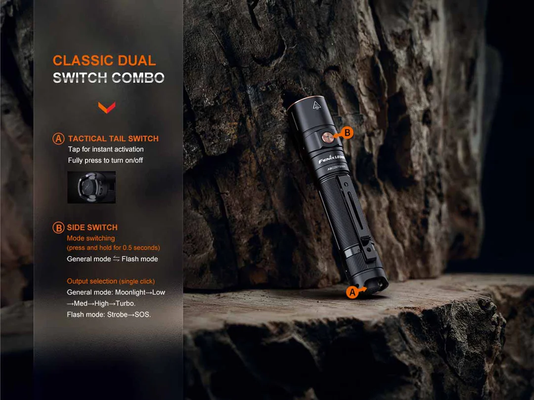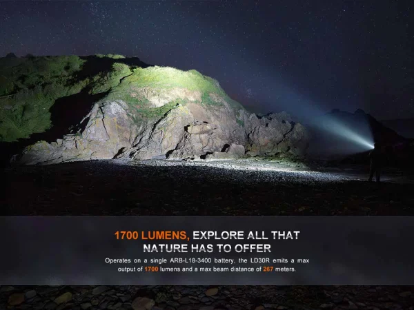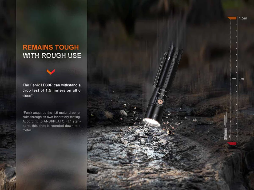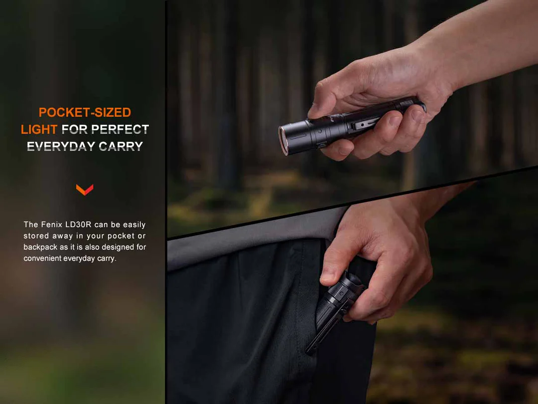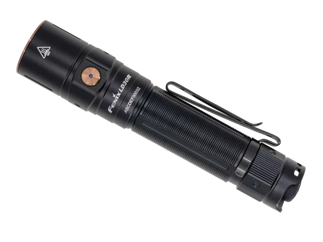 The Fenix LD30R Rechargeable Flashlight is a powerful everyday carry flashlight with a maximum output of 1700 lumens. Activate it with the tactical tail switch and cycle through seven lighting modes using the side switch. USB Type-C rechargeable with a battery level indicator helps keep your flashlight charged and at the ready. Plus, its two-position body clip makes it even more convenient to carry. With a durable IP68-rated waterproof and dustproof rating, you’ll have a flashlight that won’t let you down.