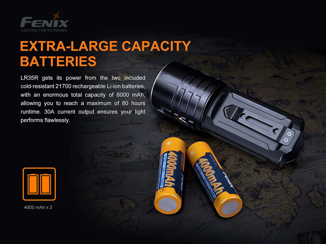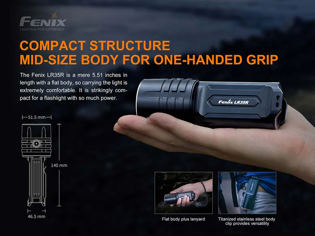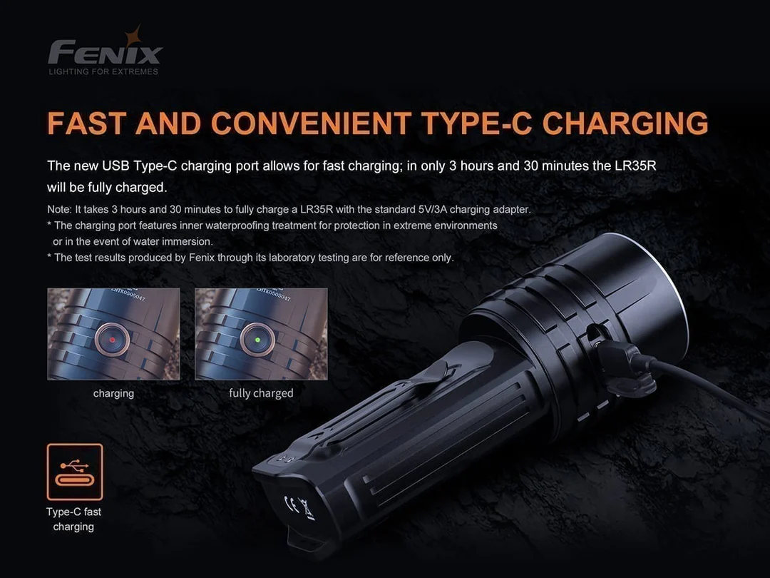 The LR35R is an extremely powerful flashlight that is capable of blasting an incredible 10000 lumens of light from a flashlight that is only 5.5” long. Powered by two 21700 rechargeable li-ion batteries, the LR35R is USB Type-C rechargeable and includes a battery level indicator to keep track of your batteries status. Intelligent step-down overheat protection helps keep the light from overheating while using the maximum outputs. The LR35R 10000 lumen flashlight is IP68 dustproof and waterproof. Perfect for outdoorsmen, or for anybody who wants to dramatically light up the night, the LR35R defines what is possible from a mid-sized flashlight! Please note this light requires a wall charger that is at least 2 AMPS for proper charging.