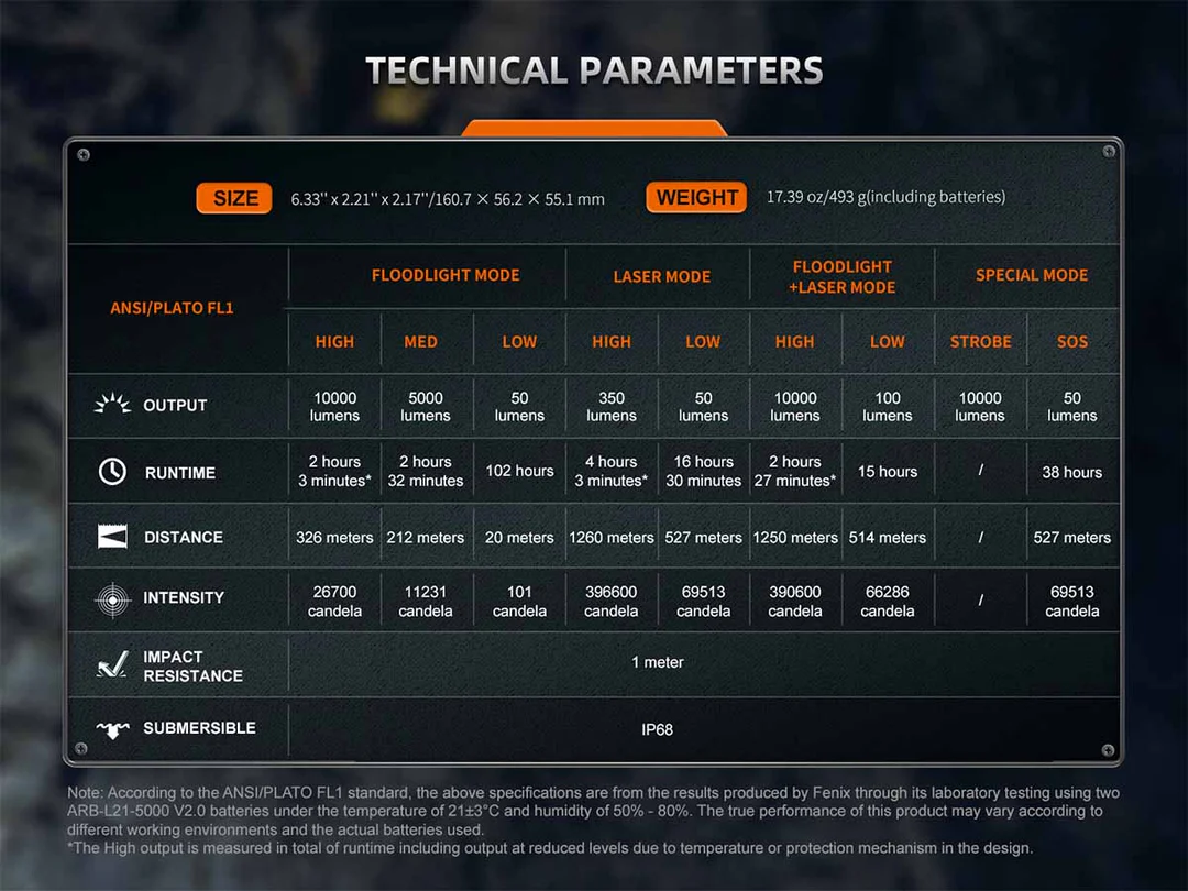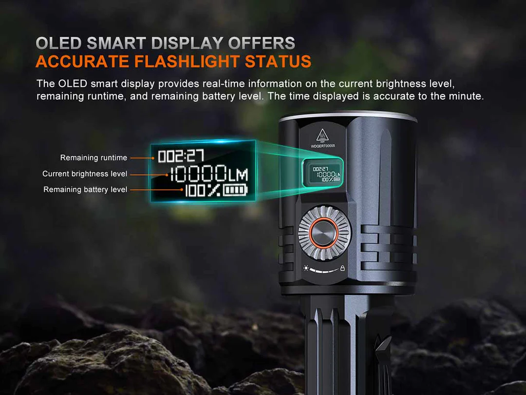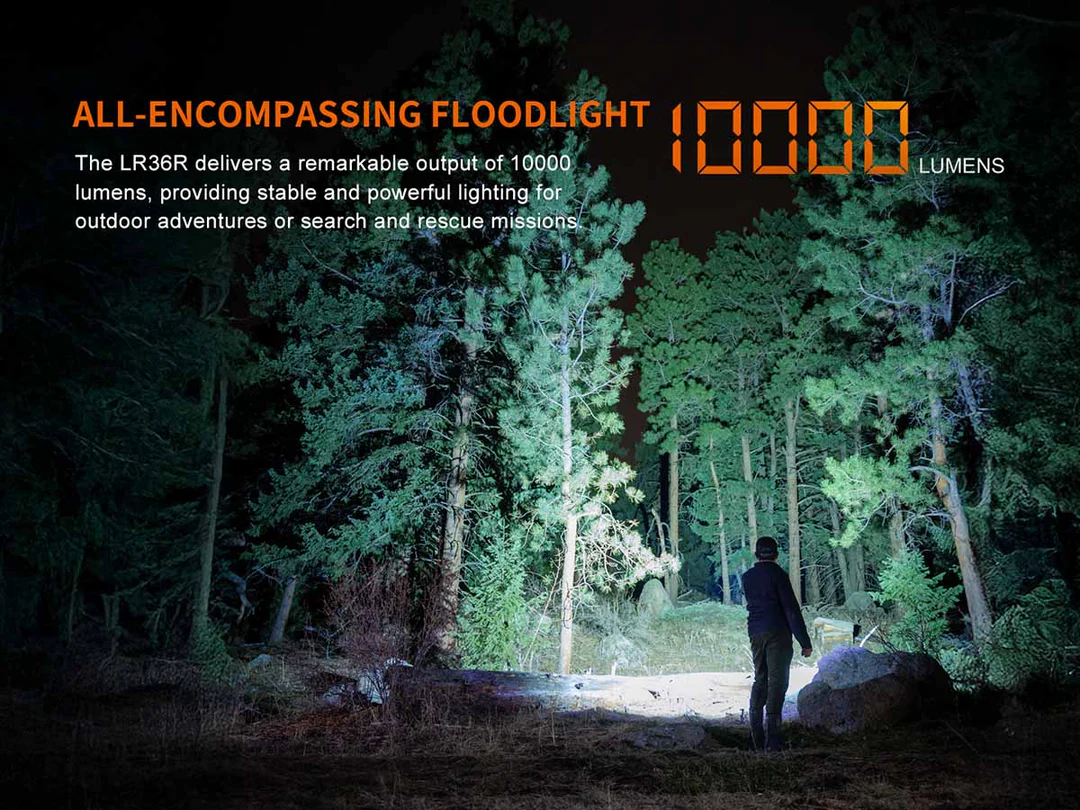 The Fenix LR36R is a powerful flashlight that combines a 10,000-lumen floodlight and a white laser into one versatile tool. Its white laser beam reaches an impressive 4133 feet (1260 meters), while the floodlight ensures wide-area illumination. The OLED smart display keeps you informed with real-time updates on your settings, and the rotating dial offers precise, stepless brightness control. With five modes—Floodlight, Laser, Floodlight + Laser, Strobe, and SOS—you’ll always have the right lighting at your fingertips. Powered by dual 21700 rechargeable Li-ion batteries, the Fenix LR36R delivers up to 102 hours of runtime. With the Fenix LR36R, you get the perfect combination of power, precision, and reliability in one flashlight.