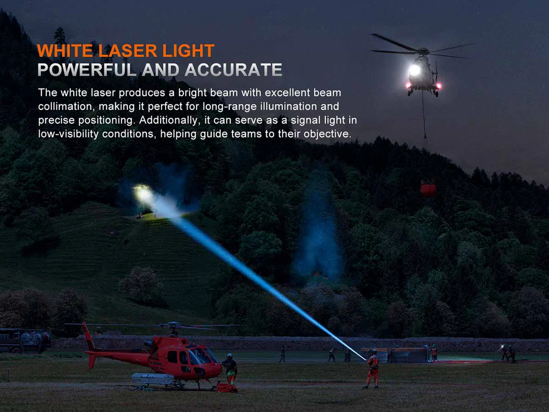 - Combined white laser and floodlight for both long-range and close-up illumination.