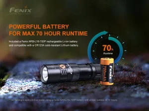 Included: Fenix ARB-L16-700P rechargeable li-ion battery, USB Type-C charging cable, lanyard, 2 x spare O-rings, two-position body clip