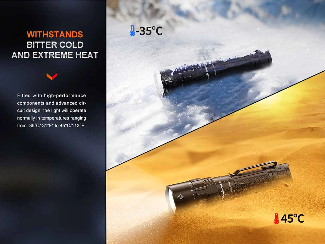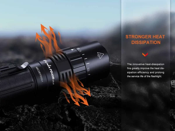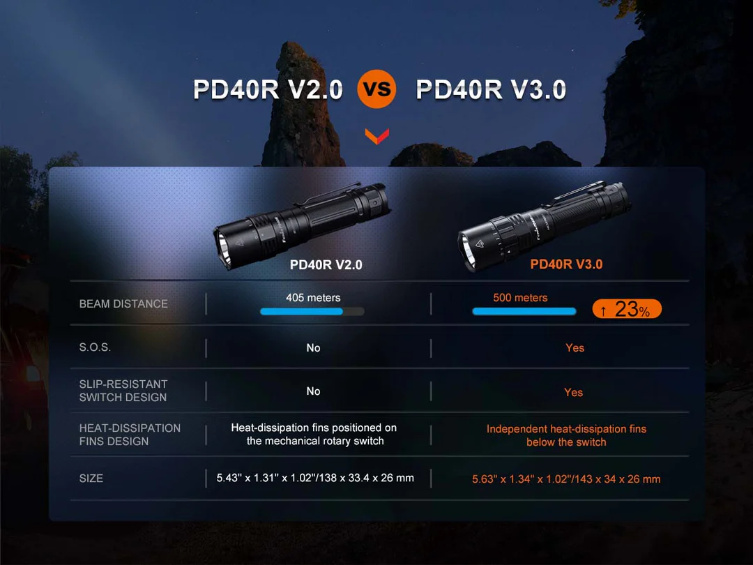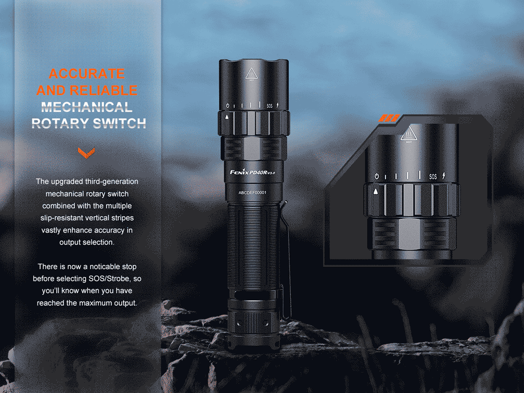 The Fenix PD40R V3.0 Rechargeable Flashlight is an upgrade that checks all the improvements customers have been asking for. The newly designed patented mechanical switch has raised grips for easy one-handed operation. Simply rotate the dial to access its modes—great for gloved hands. There is a hard stop before you progress to the flashing modes so you’ll always know when you are at the brightest setting without accidentally activating SOS or Strobe. Able to blast a maximum of 3000 lumens now 23% farther, this flashlight is USB Type-C rechargeable. NO TAIL SWITCH allows for the tail to stand the light and an IP68 rating makes it durable in any conditions. Choose the Fenix PD40R V3.0 Flashlight when you need maximum brightness with a simple-to-use interface.