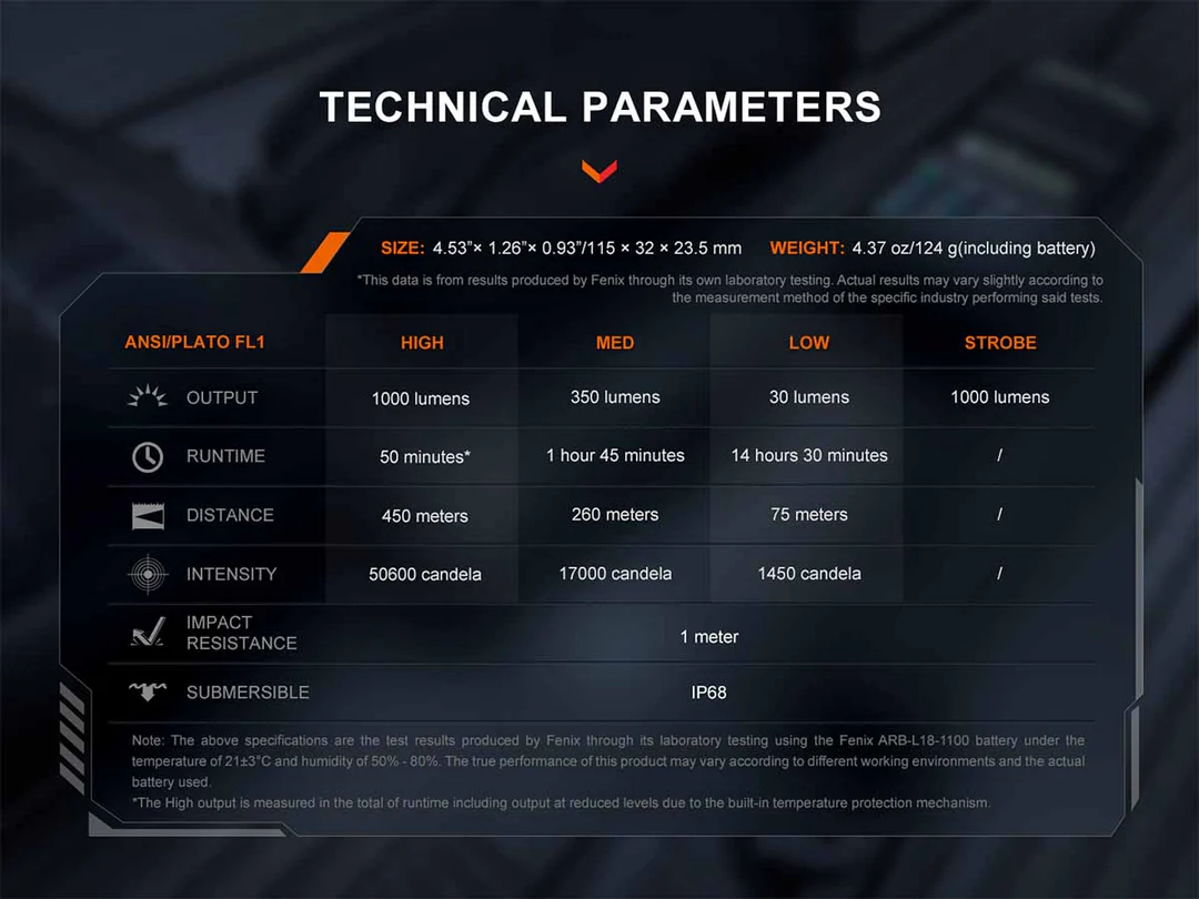 - Powered by one Fenix ARB-L18-1100 rechargeable battery.