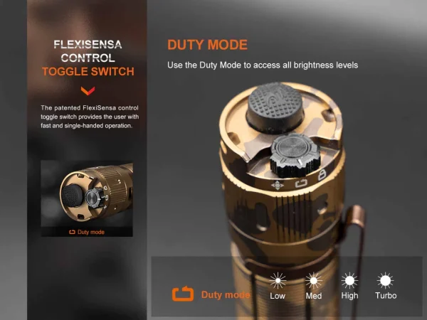 - Intelligent memory – in Tactical or Duty mode, the light memorizes the last selected output including Strobe
