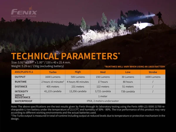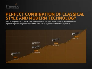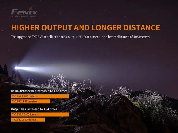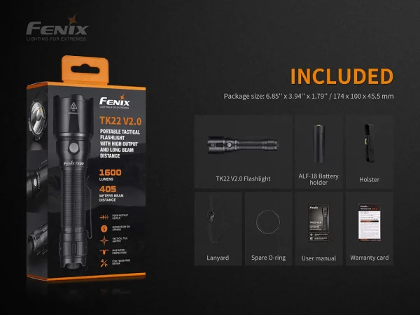 The Fenix TK22 V2.0 tactical flashlight is an upgraded version of the popular tactical flashlight the TK22. Featuring improved performance, this flashlight can throw 1600 lumens a staggering 1,329 feet (405m). It can be powered by either a 21700 or an 18650 battery (no battery included) with the included ALF-18 battery insert allowing for longer runtimes than its predecessor. Quickly activate the flashlight with the tactical tail switch and cycle through five lighting modes with the side switch. Durable and rugged, with a toughened ultra-clear glass lens, the TK22 V2.0 continues to be a top choice in tactical flashlights.