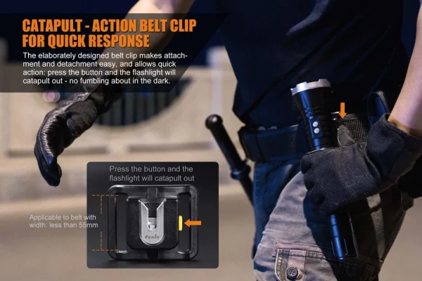 - Dedicated catapult-action belt clip