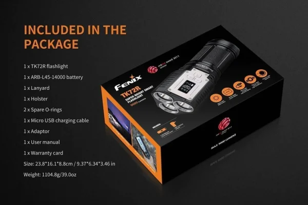 The TK72R Rechargeable Flashlight is Fenix’s most powerful flashlight to date; throwing a light beam over 300 yards with a maximum light output of a blinding 9000 lumens! Operation is made easy by its three stainless steel button interface. Choose from any brightness level from 100 to 9000 lumens (increments of 100) by simply pressing the PLUS or MINUS buttons. The OLED display shows the flashlight’s current status, including brightness level in lumens, available runtime and remaining battery level. The included battery pack is micro-USB rechargeable and can also be used as a power bank to charge other devices. Waterproof and dust proof, this flashlight is comfortable in rough spots where extreme light and versatility are at the forefront.