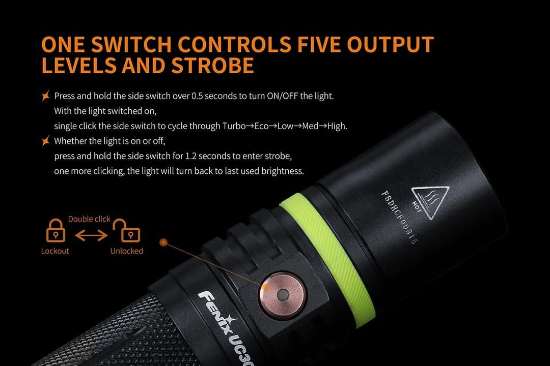 The newly upgraded Fenix UC30 rechargeable flashlight is fitted with a Cree XP-L HI LED which delivers a maximum output of 1000 lumens and a beam distance of 830ft (253m) all powered by one included rechargeable 18650 Li-ion battery. Five output levels and strobe are controlled by the stainless steel side switch which also includes a battery level indicator. Waterproof and dust proof, the UC30 rechargeable flashlight is the perfect tool for every day carry and outdoor activities.