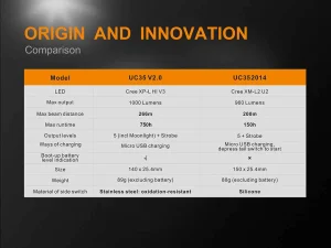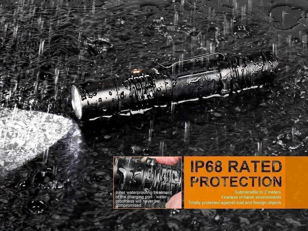 The Fenix UC35 V2.0 rechargeable flashlight is the 2018 upgrade to the Fenix UC35 flashlight. Fitted with the Cree XP-L HI V3 LED, this light delivers a maximum 1000 lumens at a distance of 873 feet (266 meters). Turn the light on and off with the tactical tail switch and cycle through the six lighting modes via the newly designed metal side switch—which also has a built-in battery level indicator. You can achieve an incredible 800 hours of runtime when using the new moonlight brightness level. Compact and built-tough, the Fenix UC35 V2.0 flashlight is IP68 rated; dust proof and waterproof underwater to two meters.
