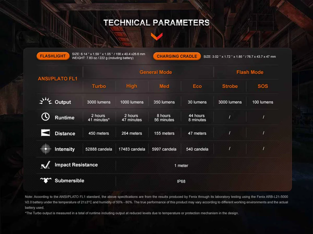 - Uses a Luminus SST70 LED with a lifespan of 50,000 hours.